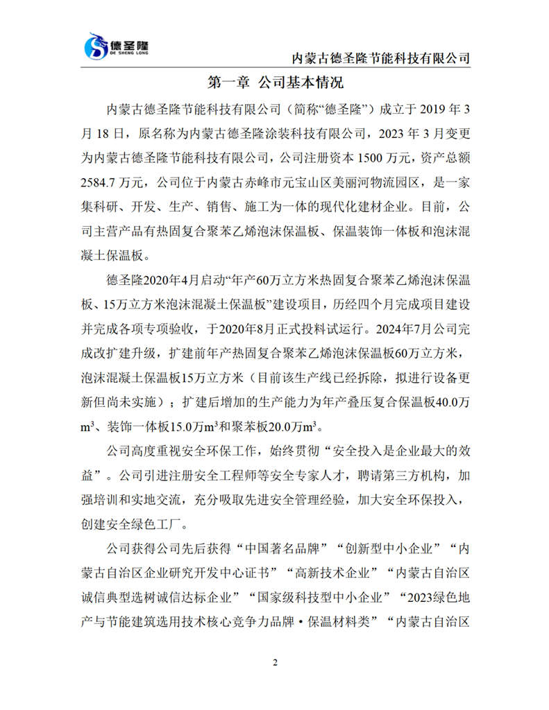 內(nèi)蒙古德圣隆節(jié)能科技有限公司成立于2019年,位于內(nèi)蒙古赤峰市元寶山區(qū)美麗河鎮(zhèn)物流園區(qū),是一家集科研、開發(fā)、生產(chǎn)、銷售、施工為一體的現(xiàn)代化建材企業(yè)。公司主營產(chǎn)品:熱固復(fù)合聚苯乙烯泡沫保溫板、保溫裝飾一體板和泡沫混凝土保溫板,年生產(chǎn)能力達到6000000平方米。